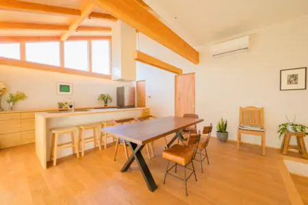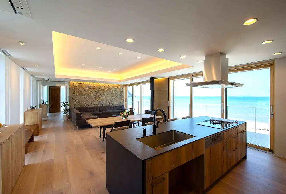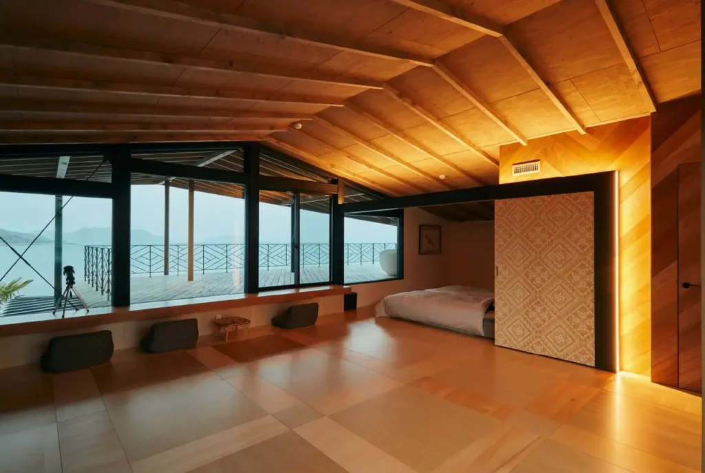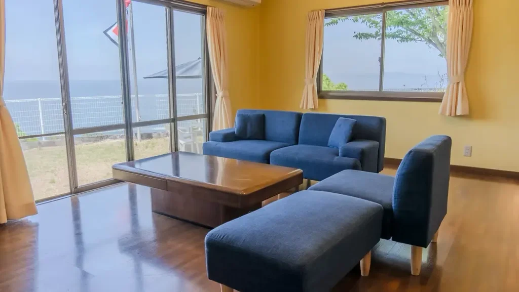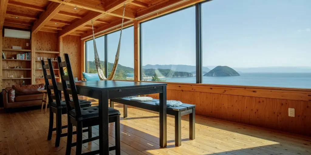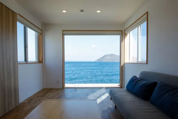 1階部分は大きなLDKが設置されており、調理用のキッチンも備わっています。一方の2階部分は寝室で、2部屋に分かれており、片方には大きなバルコニーがあります。バルコニーからは、風光明媚な瀬戸内海の風景を楽しむことが可能です。
