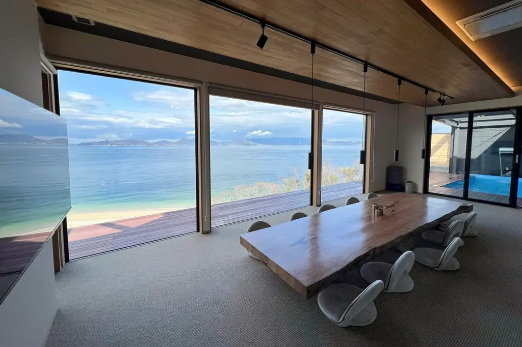 部屋はダイニングを兼ねた大きな広間や、寝室としても利用できる和室など複数あります。広間の横には日本庭園があり、縁側越しに四季折々の風景を楽しむことができます。一方の和室からは風光明媚な瀬戸内海と近くの漁港を一望可能です。